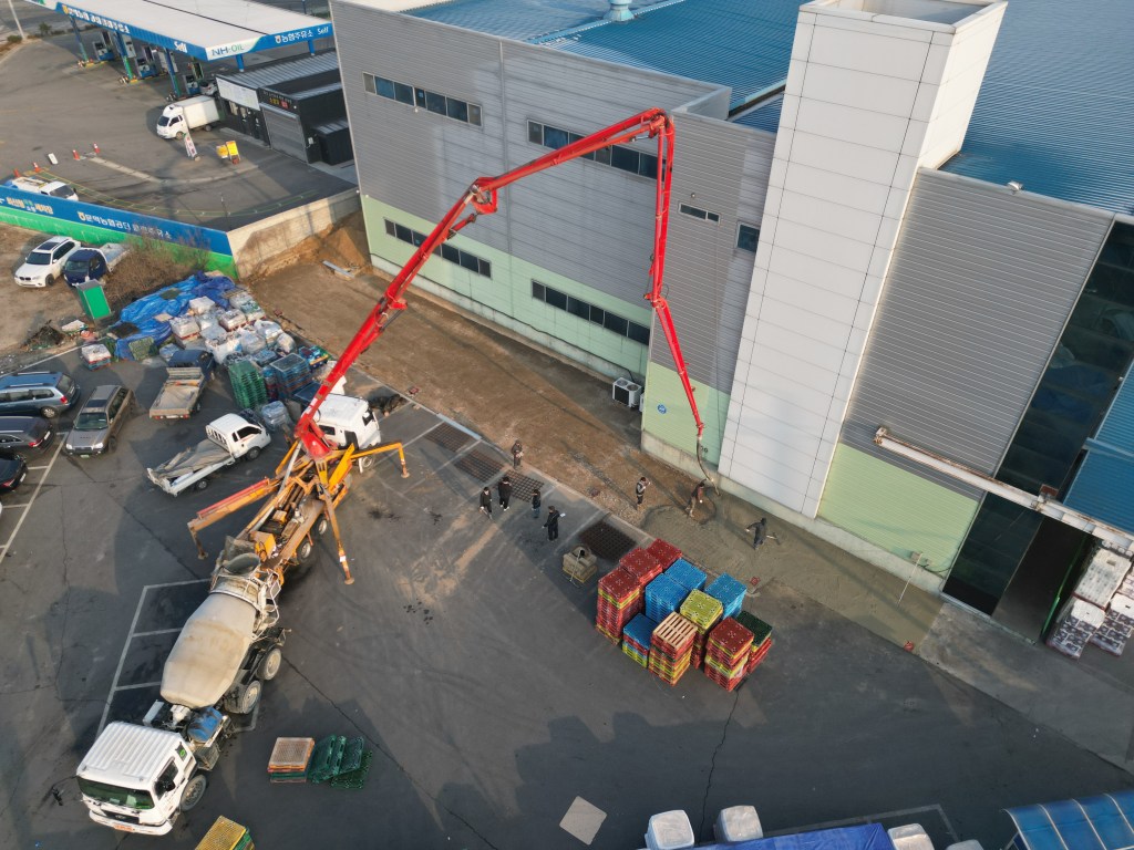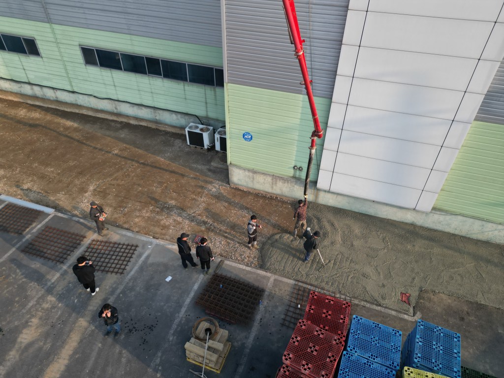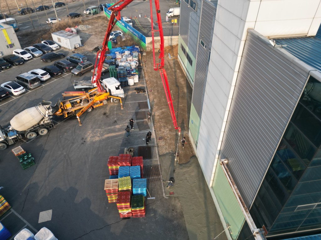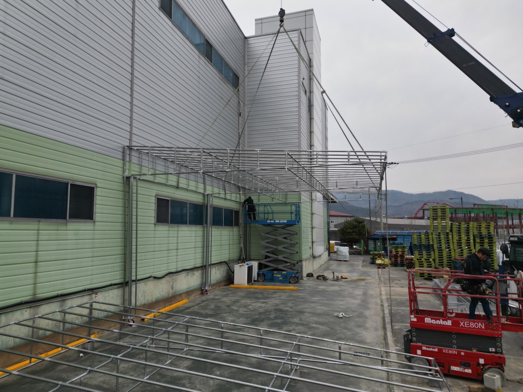 규모에 따라 상이하지만, 본 현장에서는 자재매입과 공장 사전제작 3일, 현장으로 화물납품하여 현장시공 1일, 이후 측정한 칫수에 맞추어 천막업체에서 천막을 납품하면 천막을 씌우고 건축물과 이어지는 부분에 물매를 플래싱으로 잡아주어 실제 현장에서의 작업은 2~3일 정도 소요되며 본래 흙바닥으로 되어있어 폐기물 정리와 콘크리트 타설까지 함께 진행되었습니다.